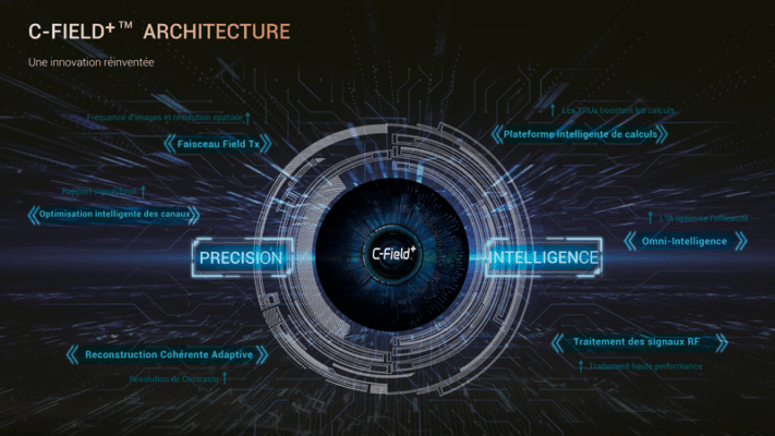 L’architecture C-Field+™ représente une avancée majeure en imagerie médicale. Elle intègre une technologie de pointe du faisceau C-Field, garantissant haute résolution et qualité d’image uniforme, essentielles pour des diagnostics précis. Elle dispose également d’un moteur de traitement innovant des signaux RF, doté d’une technologie avancée d’analyse augmentée, permettant une transmission d’images plus rapide et des visuels d’une clarté exceptionnelle.